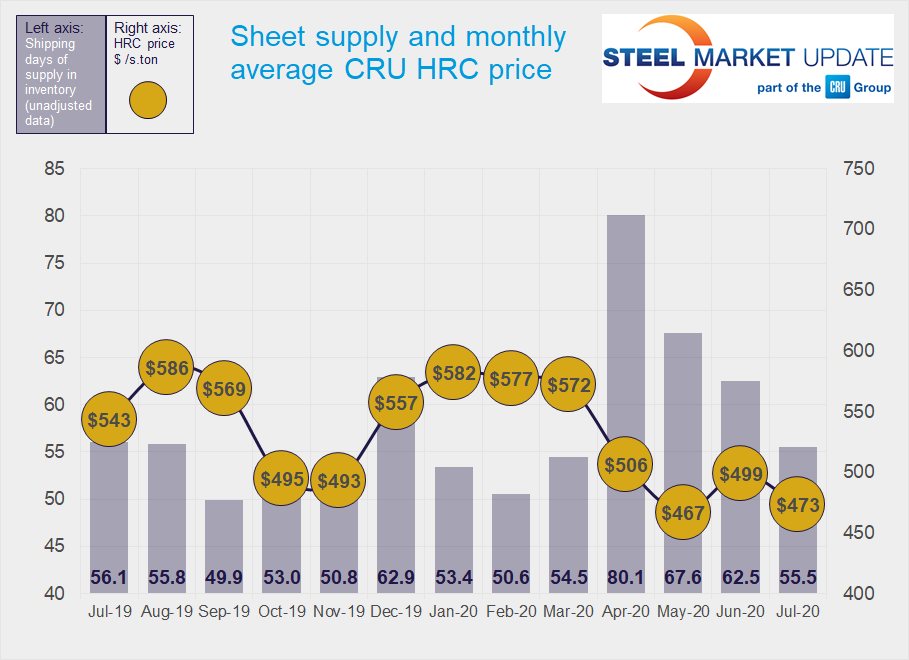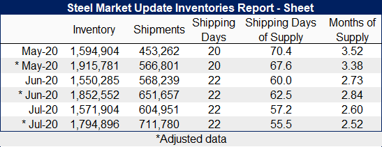 Service centers pared down flat-rolled steel supply in July to 55.5 shipping days of supply, according to preliminary data, down from 62.5 in June’s adjusted data. Inventories represented 2.52 months of supply in July, down from 2.84 in June. July had 22 shipping days, the same as June.