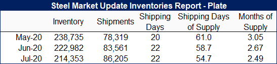 Service centers cut back plate inventories 3.9 percent in July, while shipments picked up 3.2 percent. Overall, supply dropped to 54.7 shipping days of supply in July from 58.7 in June. Service centers carried 2.49 months of plate supply at the end of July, down from 2.67 in June.