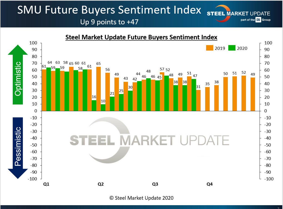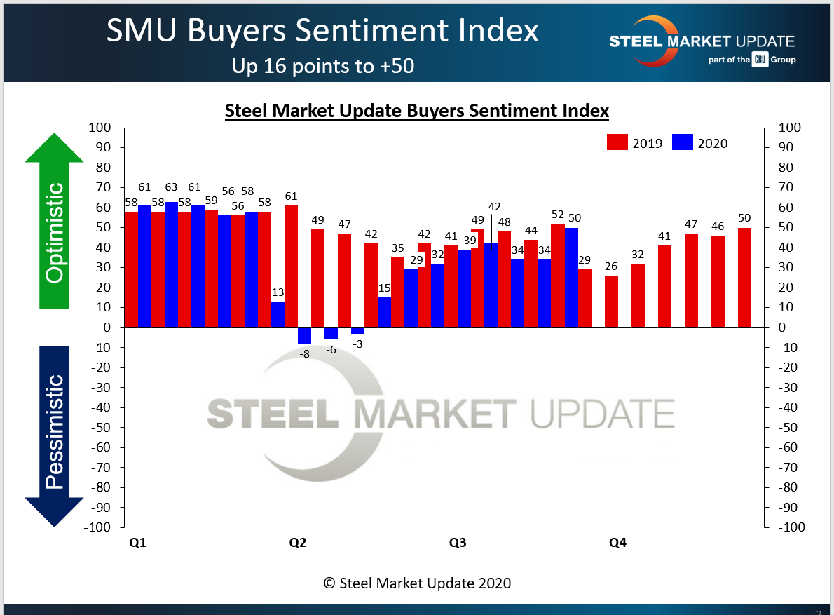 SMU asks steel buyers how they view their company’s chances for success in the current environment. The Current Sentiment reading this week jumped 16 points to a reading of +50, which takes it near levels at this time last year. Current Sentiment has recovered from a low of -8 in the first week of April, its lowest reading since November 2010, as the coronavirus disrupted the market