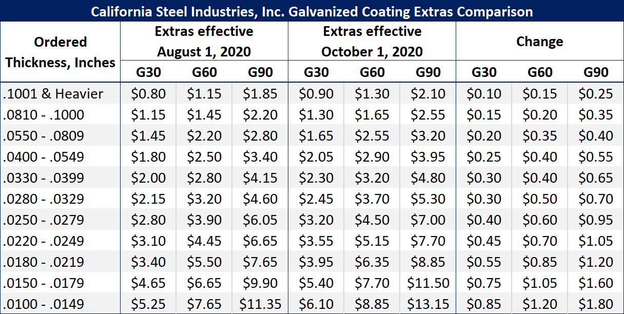 California Steel Industries notified customers on Wednesday that it will be raising the extra charge for galvanized coatings due to an increase in the market price of zinc. CSI advised customers: “Due to changing zinc costs, our Galvanized Coating Extras have been revised. These changes will be effective beginning with orders placed for October shipment and later.”