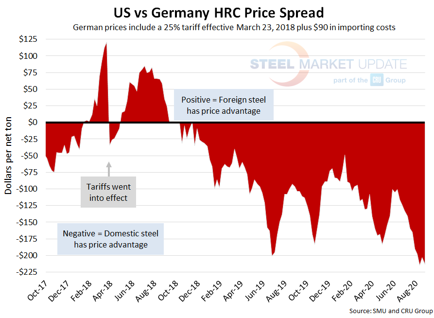 As of Wednesday, Aug. 26, the CRU German HRC price was $486 per net ton, up $24 over the previous week and up $34 from two weeks prior. Adding tariffs and import costs, that puts the German price at $698 per ton delivered to the U.S. The latest SMU hot rolled price average is $485 per ton, up $20 over last week and up $45 over two weeks prior. Therefore, domestically sourced HRC is theoretically $213 per ton cheaper than imported German HRC; the spread was $203 last week and $215 two weeks ago (all-time high). U.S. prices have held this price advantage for over a year and a half.