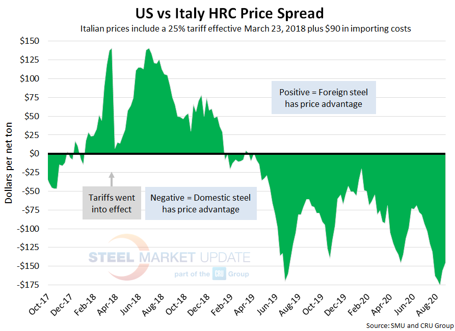 CRU published Italian HRC prices at $432 per net ton, up $7 from last week and up $11 over two weeks ago. After adding tariffs and import costs, the delivered price of Italian HRC is approximately $630 per ton. Accordingly, domestic HRC is theoretically $145 per ton cheaper than imported Italian HRC; the spread was $156 the previous week and $176 two weeks prior (all-time high). U.S. prices have held this price advantage for over one year.