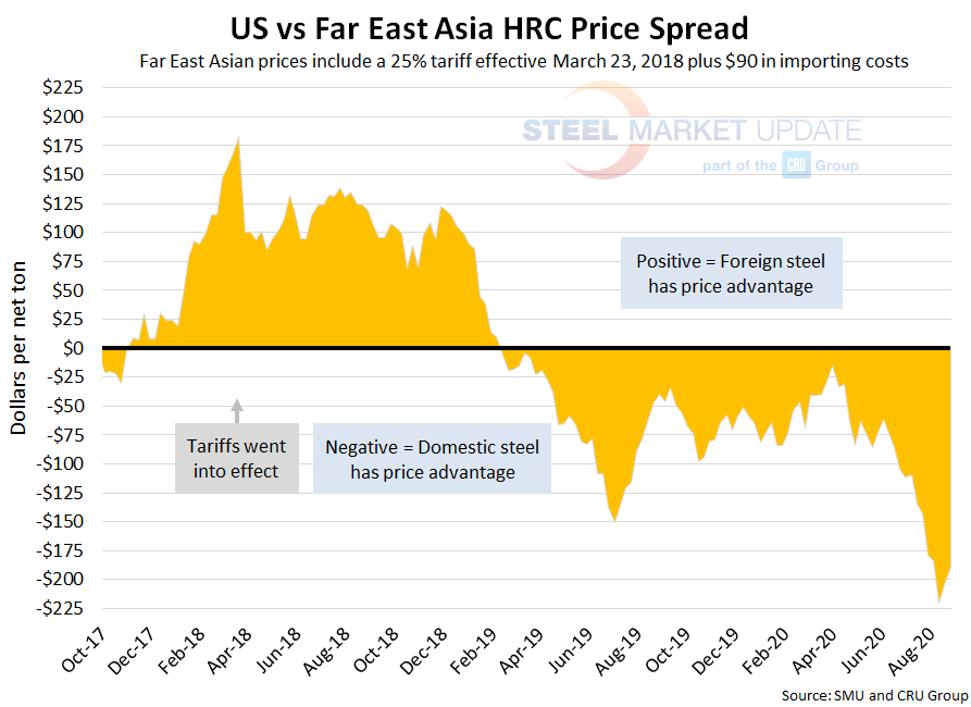 The CRU Far East Asian HRC price rose $4 per ton over last week to $467 per net ton, $11 higher than the price two weeks ago. Adding tariffs and import costs, the delivered price of Far East Asian HRC to the U.S. is $674 per ton. Therefore, U.S.-produced HRC is theoretically $189 per ton cheaper than imported Far East Asian HRC; the spread was $204 last week and $220 two weeks ago. Domestic prices have held this price advantage for a year and a half.