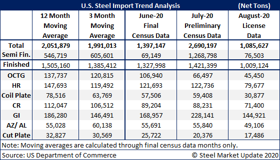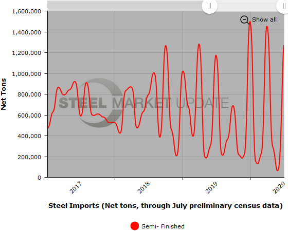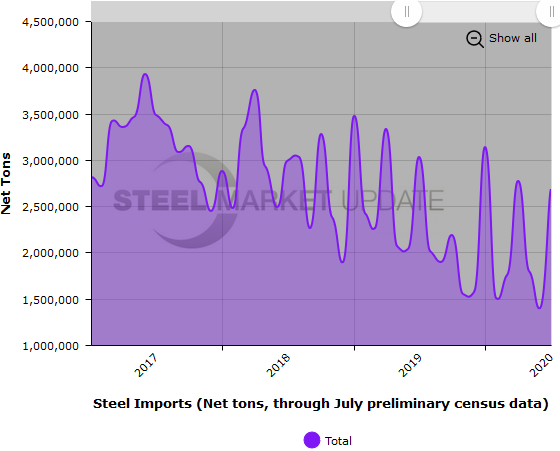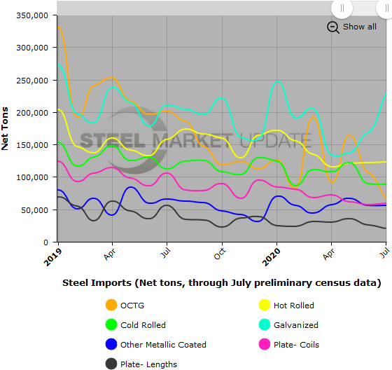The three graphics below show steel imports through July preliminary Census data. To provide the most clarity, we are only showing a limited time line in each graphic. To see a greater data history and utilize our interactive graphing features, you can visit our website. Contact us at info@SteelMarketUpdate.com if you have any questions.