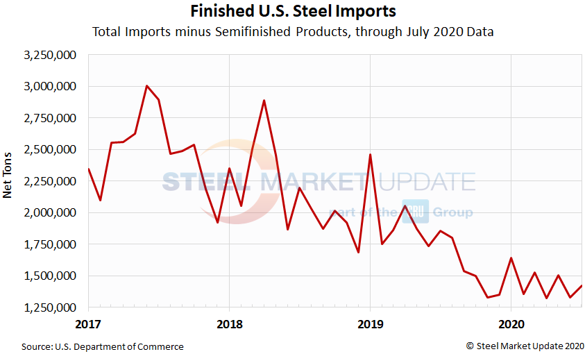 Taking semifinished products out of the picture, imports of finished steels rose 7 percent from June to July; 1.42 million tons of finished steel products are reported to have been imported, up 93,000 tons from June figures.