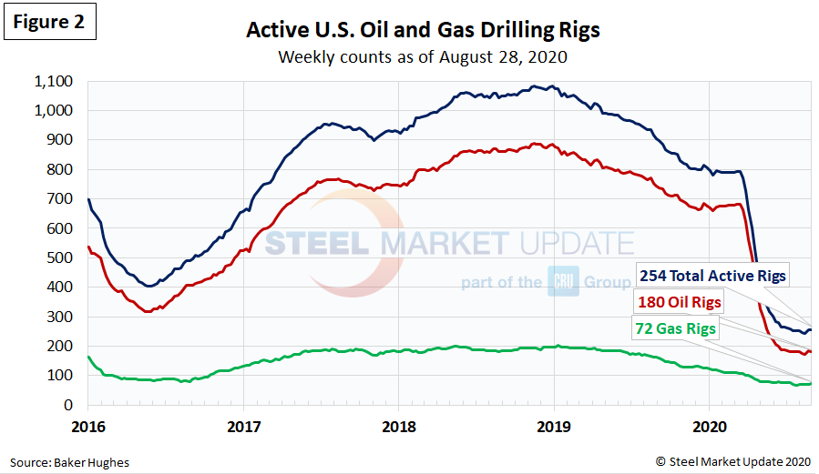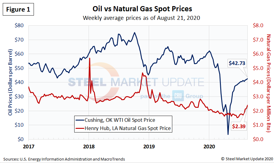 The spot market price for West Texas Intermediate (WTI) has rebounded somewhat from the plunge after the cornonavirus shutdowns, increasing to $42.73 per barrel as of Aug. 21. Natural gas at the Henry Hub in Oklahoma was priced at $2.39 per MMBTU (million British Thermal Units) as of Aug. 21, up significantly from one month ago ($1.72) and up from the beginning of the year ($2.05).