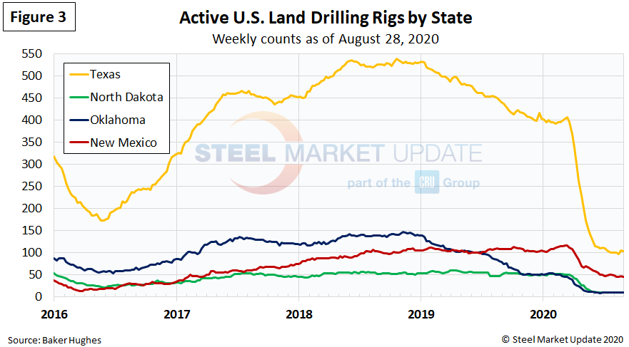 U.S. oil and gas production are heavily concentrated in Texas, Oklahoma, North Dakota and New Mexico, which have all seen declines of more than 70 percent in active drill rigs since mid-March. The rig count in Texas plummeted from 407 in mid-March to 104 as of last week (Figure 3).
