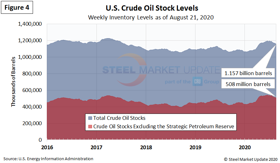 Total crude oil stocks in the U.S. had been on the rise since mid-March, but started to decline in July, falling to 1.157 billion barrels as of Aug. 21, up from just over 1 billion barrels at the beginning of the year (Figure 4).