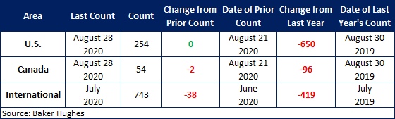 The decline in active U.S. rigs drilling for oil and gas remains flat as of last week to 254 rigs, including 180 oil rigs, 72 gas rigs and 2 miscellaneous rigs, according to the latest data from Baker Hughes (Figure 2). That’s a decline of 68 percent from the 793 rigs in production in March prior to the coronavirus shutdowns. The table below compares the current U.S., Canada and International rig counts to historical levels.