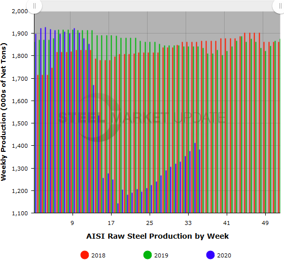 Note: The raw steel production tonnage provided in this report is estimated. The figures are compiled from weekly production tonnage from 50 percent of the domestic producers combined with monthly production data for the remainder. Therefore, this report should be used primarily to assess production trends. The AISI monthly production report provides a more detailed summary of steel production based on data supplied by companies representing 75 percent of U.S. production capacity. Capability for third-quarter 2020 is approximately 29.4 million tons, compared to 30.6 million tons for the same period last year and 29.1 million tons for the second quarter of 2020.