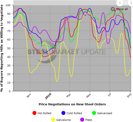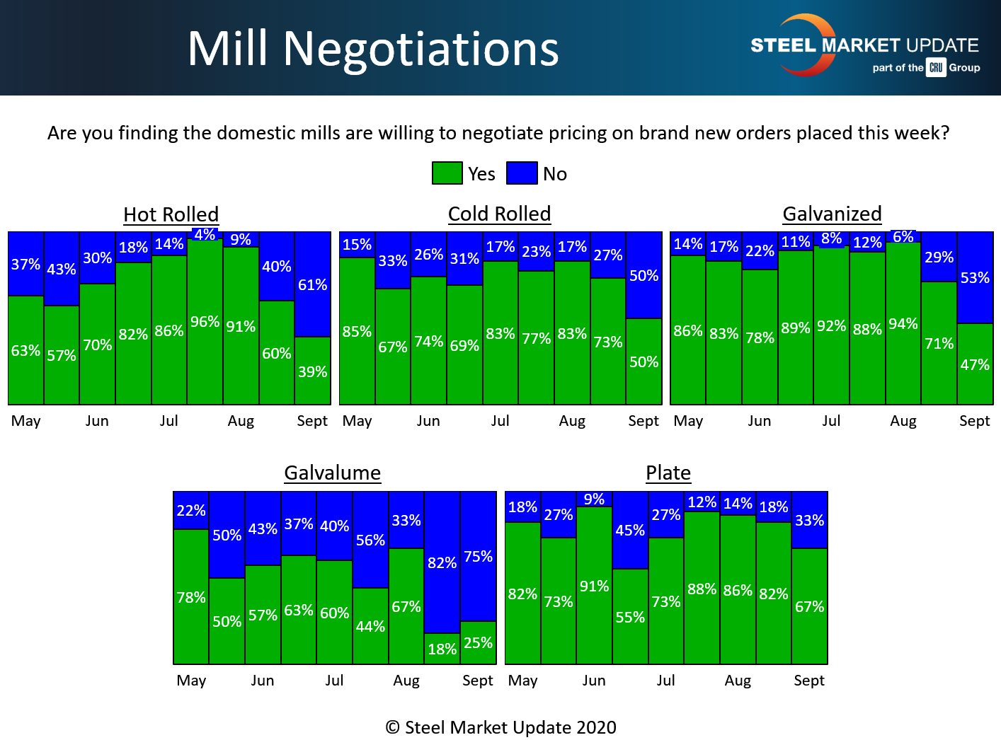 In galvanized, 47 percent reported the mills still open to discounts, but the majority, 53 percent, said the mills “just say no.” About 75 percent said the mills are holding firm on Galvalume prices, as supplies are expected to tighten in the fourth quarter.