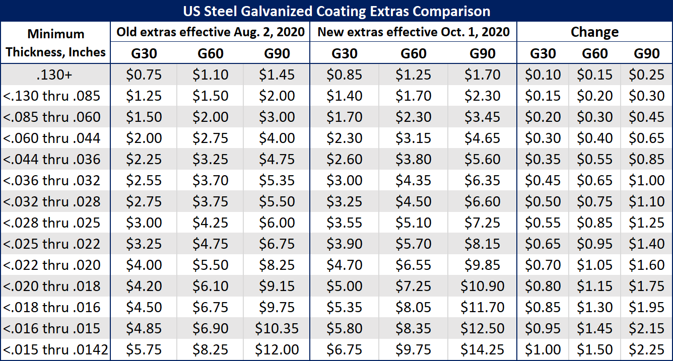 On Wednesday, U.S. Steel notified customers of a revision to its galvanized and galvannealed steel coating extras. USS advised customers, “The cost to procure zinc for our Hot Dipped Galvanized products has increased significantly in recent weeks, with the average LME zinc price now above the current coating weight tables that we put in place earlier in the quarter. Consistent with past practice, we will be increasing our coating weight tables for Hot Dipped Galvanized and Galvannealed spot orders effective with shipments beginning Oct. 1, 2020, reverting to the tables that were in place before the August adjustment.”