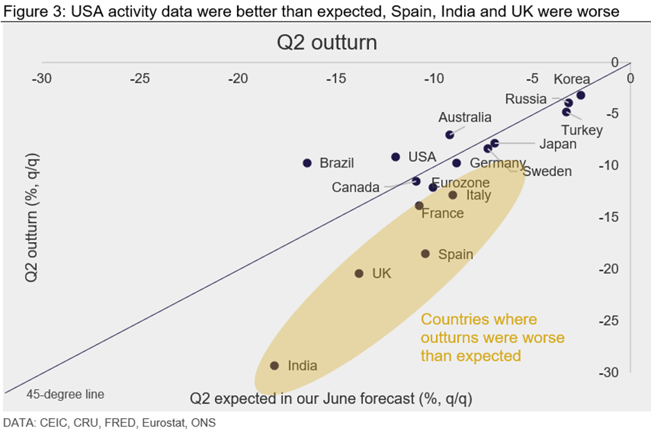 The damage from stringent lockdowns in April is captured in the Q2 data. This month we received Q2 data for several EM economies including India, Brazil, Russia and Turkey. These data have been incorporated into our latest forecasts for 2020. Figure 2 sets out the lessons learned from these data. There are two key lessons.