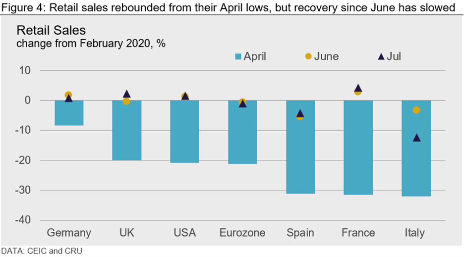 Between June and July, the improvement in retail sales slowed; this is captured by the small distance between the two markers for the two months. It means that recovery lost momentum from June. Italy is an exception, taking a step backward as retail sales fell in July. We expect this period of slow growth or what we call the “long slog” to continue until a vaccine is found. Without a vaccine, a cloud of uncertainty looms over job security for individuals and over business prospects. This suppresses consumer and corporate spending and hinders full recovery.