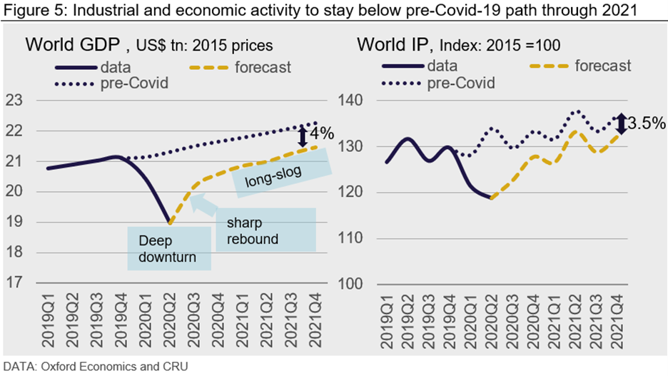 World industrial production (IP) tends to be more volatile than world GDP. The recovery in IP in the remainder of 2020 and 2021 is expected to be a little stronger than world GDP. That is partly because Covid-19 and the need to socially distance hurts the consumer sector (e.g. hospitality and restaurants) more than it hurts mining, utilities and manufacturing activity. As a result, by end 2021, we forecast IP to be ~3.5 percent below its pre-Covid-19 level.