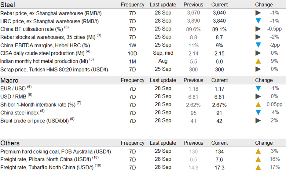 On the supply side, the main producing regions registered an outstanding week as producers pushed for higher volumes to try to boost quarterly results. Consequently, weekly shipments reached the second highest level in the year, just below the last week of June. In Australia, Port Hedland shipments remained steady at 11.3 Mt, a very strong performance, while Rio Tinto exported 7.2 Mt, one of the highest weekly volumes in the year. Over the past week, a Covid‑19 outbreak was spotted in a vessel crew arriving at Port Hedland. Australian authorities have successfully isolated the crew and we believe supply disruption risks linked to the incident are low. In Brazil, weekly exports from the north were at a very high level and shipments from the southeast also improved, though some producers there continue to struggle. On Sept. 24, Vale suspended the disposal of tailings at its B7 dam following a local court decision. As a result, the company halted activities at the Viga concentration plant and, though mining at Viga will remain unaffected, this will have an annualized impact of ~4 Mt/y in production. B7 is considered a low-risk dam and Vale will appeal the court’s decision.