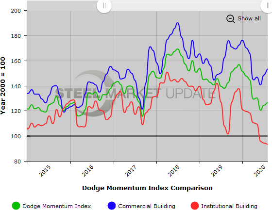 Below is a graph showing the history of the Dodge Momentum Index You will need to view the graph on our website to use its interactive features; you can do so by clicking here. If you need assistance logging in to or navigating the website, please contact us at info@SteelMarketUpdate.com.