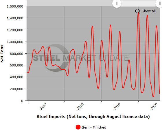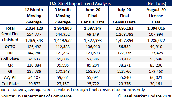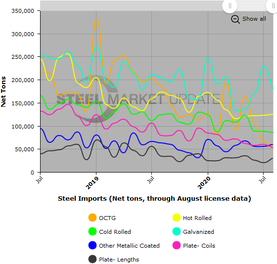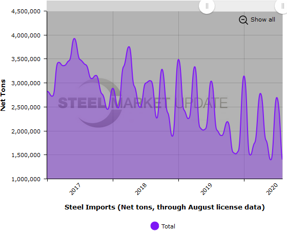 The three graphics below show total steel imports through August license data. To provide the most clarity, we are only showing a limited time line in each graphic. To see a greater data history and utilize our interactive graphing features, you can visit our website. Contact us at info@SteelMarketUpdate.com if you have any questions.