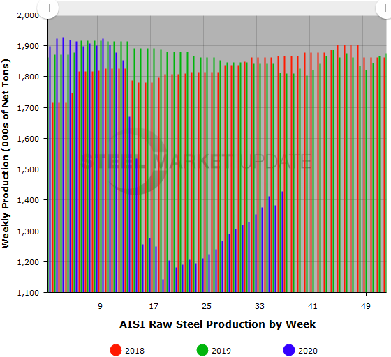 Note: The raw steel production tonnage provided in this report is estimated. The figures are compiled from weekly production tonnage from 50 percent of the domestic producers combined with monthly production data for the remainder. Therefore, this report should be used primarily to assess production trends. The AISI monthly production report provides a more detailed summary of steel production based on data supplied by companies representing 75 percent of U.S. production capacity. Capability for third-quarter 2020 is approximately 29.4 million tons, compared to 30.6 million tons for the same period last year and 29.1 million tons for the second quarter of 2020.