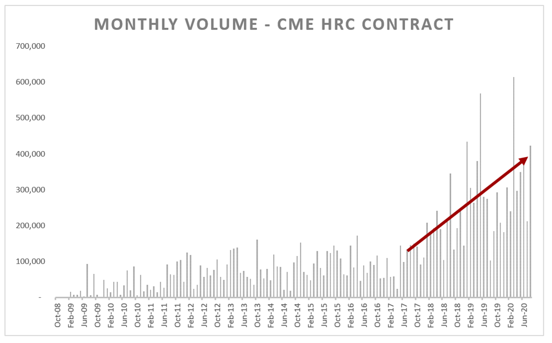 Now on to the markets. Volumes for the CME HRC contract were strong in August, coming in at over 400,000 tons. Increases have come both from existing players trading more as well as new companies getting set up to trade futures and manage risk. The chart below lends some perspective to the volume trends over the history of the contract. Keep in mind that this is just exchange cleared volumes, and a significant amount also trades “over the counter” or OTC, without going through the exchange.