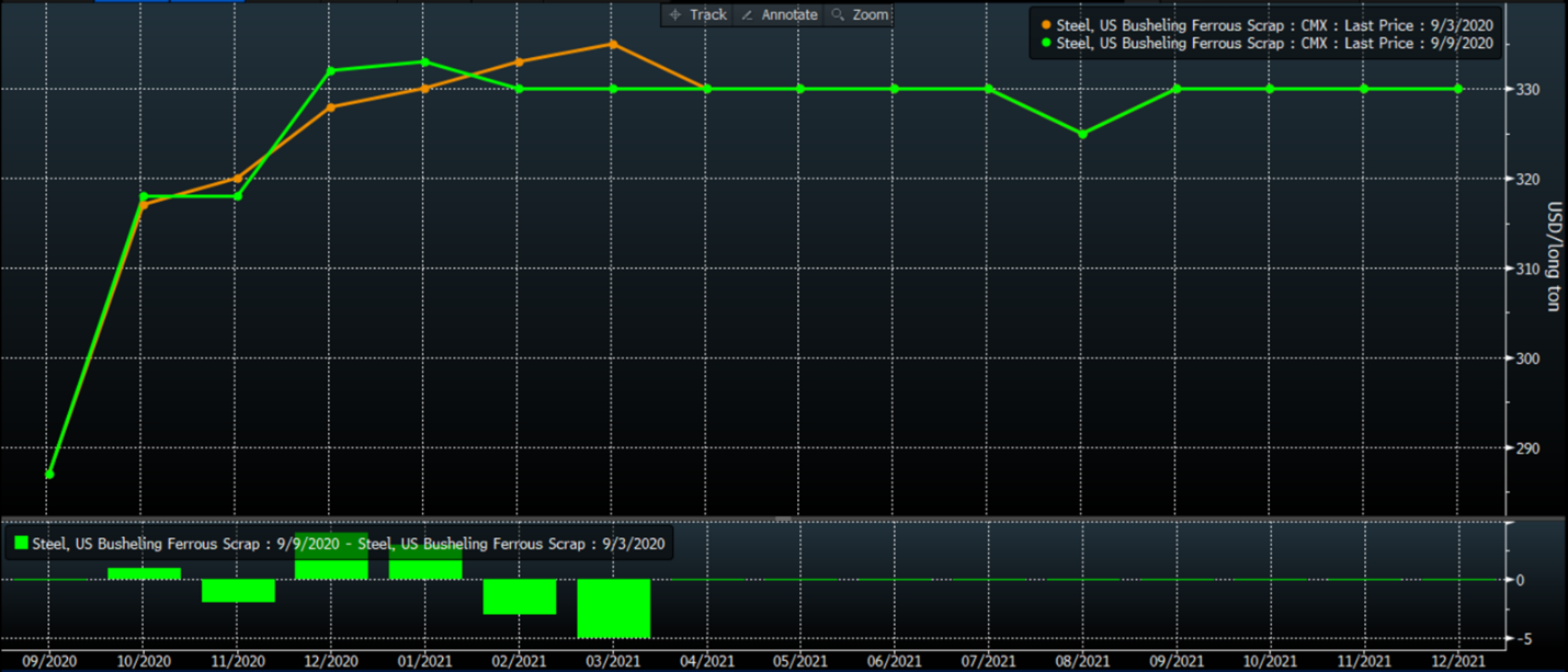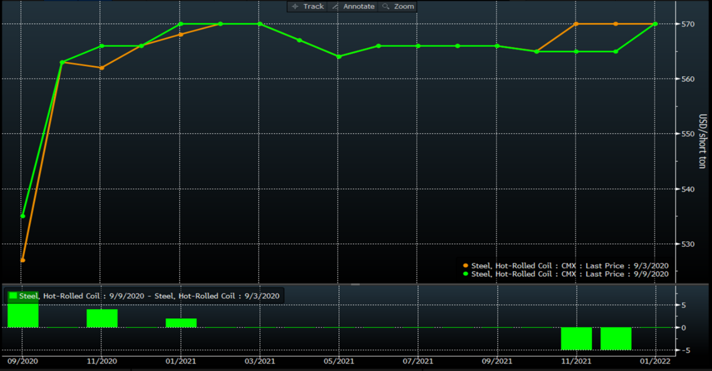 In scrap land, the curves there also didn’t change much week/week. It is worth noting the steep contango (future months higher than spot months) here, and the October contract settled at $317 yesterday, which would be another big move higher from the September settles. Certainly, with all the minimill capacity being added in the U.S., these mills will need to increase their scrap buys to feed the mill, and perhaps that is why the next few months show a steep ramp. In addition, we are moving closer to winter, which normally tightens scrap supplies and leads to higher pricing.