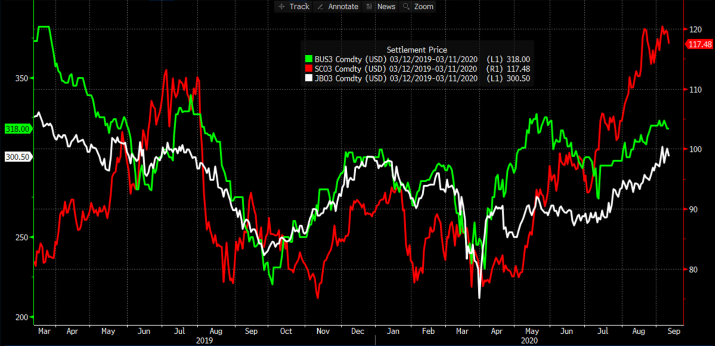 Looking at the steelmaking raw materials, you can see that ore prices continue to lead the pack. While there has been a slight pullback in the 3-month forward ore contract, you can see that with the strength in activity in China, ore prices remain high (red line). This tends to put upward pressure on the other raw materials, such as Turkish scrap (white) and the U.S. Busheling scrap contract (green).