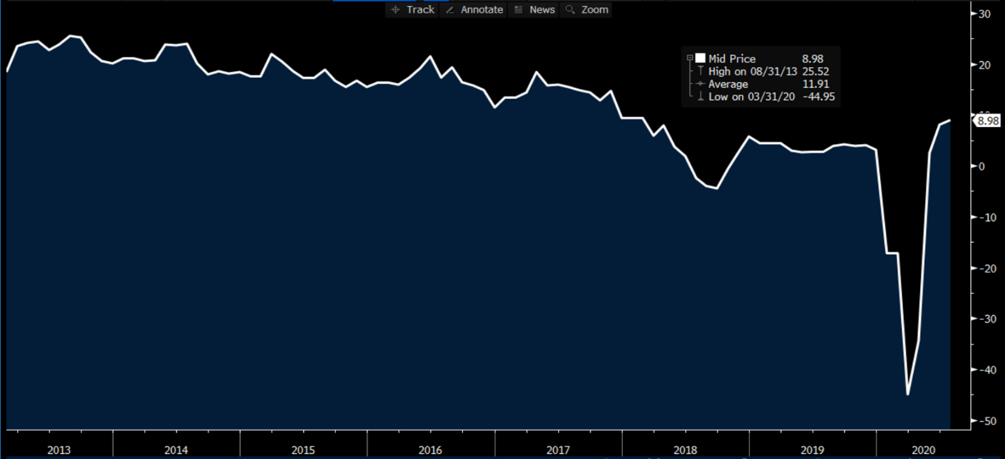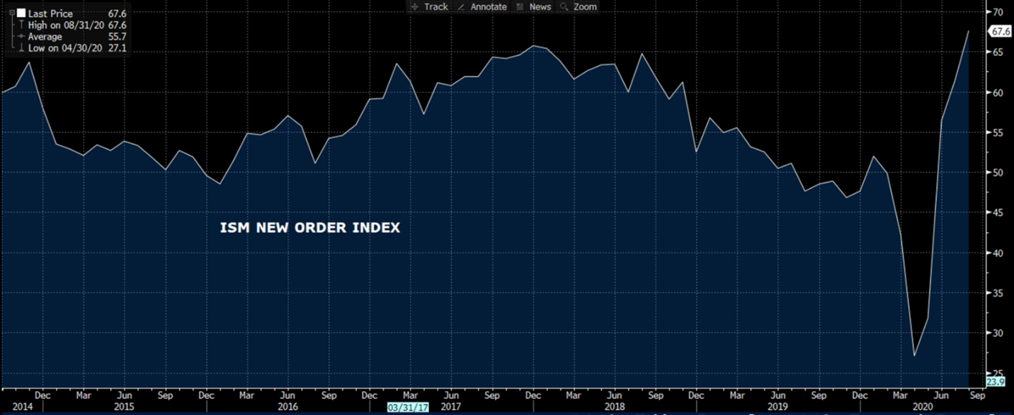 Back in the U.S., we’ve also seen economic data continue to come in above expectations in most cases. The ISM Manufacturing Index was strong early in September, but we thought the New Orders component was worth sharing, as it continues on an upward trajectory after being crushed early in the year: