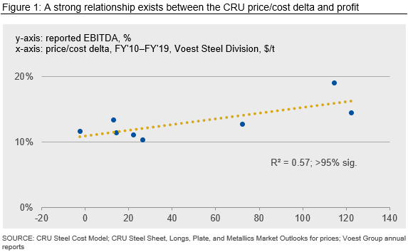 The results of our analysis, shown in Figure 1, shows the strong relationship between reported profitability and price/cost differentials (steel prices minus costs on a product by product basis for the given company) derived from CRU’s price and cost data for Voestalpine Steel Division (Voest Steel). This analysis has been carried out for many of the mills in the SCM – taking into account cost and price movements across their full sales portfolios – and similarly strong relationships have been determined, demonstrating that CRU prices and costs reflect very well real world price, cost and profitability conditions.