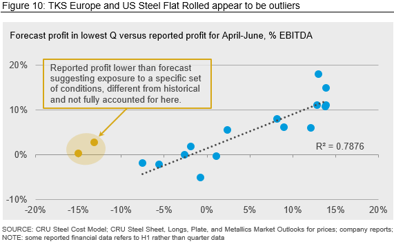 We have also compared forecast profitability in the April-June quarter (assumed lowest quarter) with recently reported results for that quarter for most of the companies analyzed. The results are shown in Figure 10, below, which shows TKS Europe and U.S. Steel Flat Rolled both appear to be outliers in this respect. However, as for all the companies analyzed here, these two are both expected to show recovery from these levels from 2021 (North Star Bluescope is also a potential outlier by this measure, but this is less clear from the data and it has not been highlighted below).