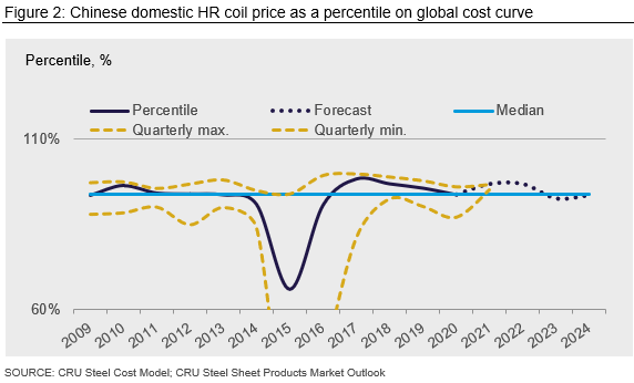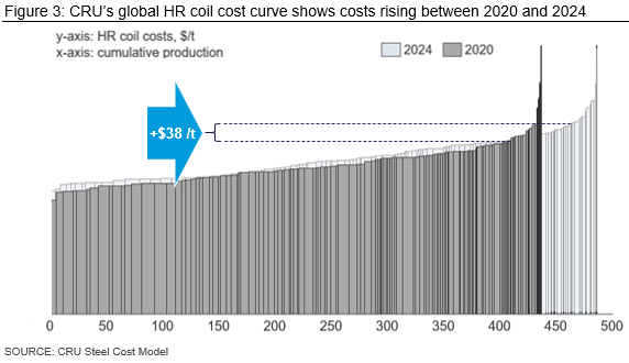 By comparing the global hot-rolled coil cost curve for 2020 and 2024, taken from CRU’s Steel Cost Model, we see production expanding over the forecast period as the steel market improves and costs rising. Median global costs are expected to rise by ~$23 /t HR coil over the forecast period, but costs in the price setting region (i.e. the 94th percentile) will rise by $38 /t HR coil; this against a forecast backdrop of falling iron ore prices, rising coal prices and significantly rising scrap prices.