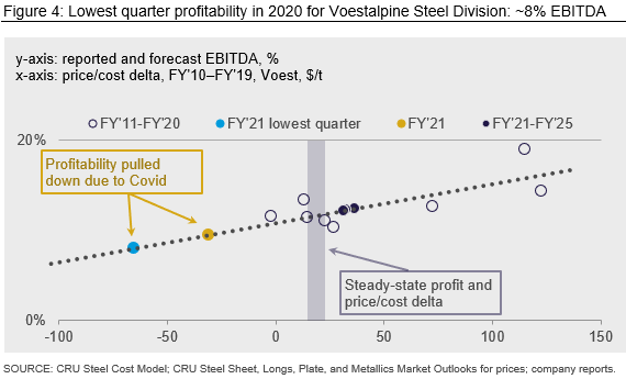 To determine the expected profitability of individual steel mills both in 2020 and out to 2024, in an environment of rising costs and prices, we have applied our approach to mills across Europe, North America, South America, Japan, and India. As an example, the chart below shows the forecast profitability of Voest Steel for FY’21 (financial year to March), for the lowest quarter of FY’21 (assumed to be calendar Q2), as well as for the forecast period to FY’25. Additionally, the historical analysis is used to determine the steady-state profitability of Voest Steel through the cycle.
