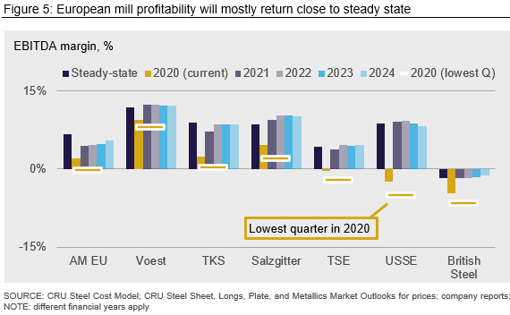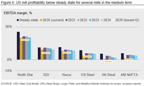 The above analysis indicates that the steady-state profitability of Voest Steel is ~12% EBITDA. Given the effect of Covid-19 on demand and prices, profitability is expected to fall to ~9% EBITDA for FY’21 overall, but the lowest quarter during the year should see profitability fall to ~8% EBITDA (this forecast is aligned with recently released financial results for Q1 giving an EBITDA of 8.2%). In FY’22, profitability will lift to ~12% and, overall, we expect Voest Steel to return to slightly above steady-state profitability in the medium term, which is shown by the dark dots in Figure 4, above. This analysis was repeated for a number of mills globally and the results are set out by region in Figures 5, 6, and 7 below.