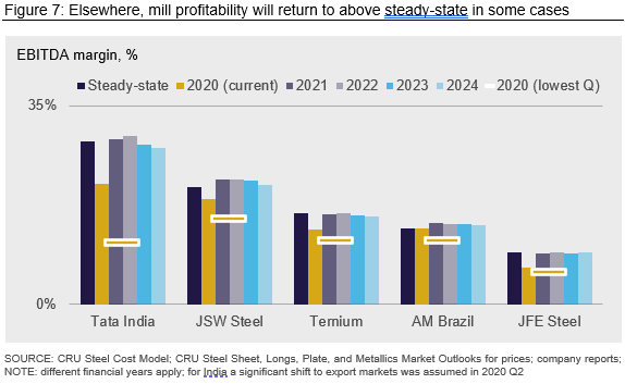 Finally, this analysis shows that some steel mills have been more sensitive to the current, Covid-19 related downturn – steel mills that are more exposed to construction sectors have been less affected – and that recovery, while following the same general trend, will not be equal. It also highlights the need to understand structural changes to costs and prices (for example the shift to the export market in India during Q2, or loss of key customer segments) to fully understand profit performance versus peers.