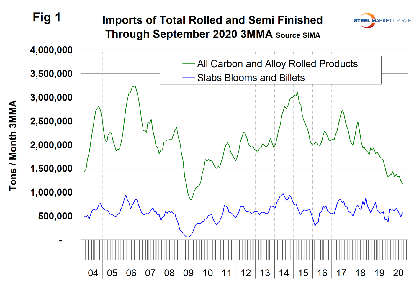 Figure 1 shows the total tonnage of rolled steel and semifinished imports through September on a 3MMA basis. Due to quota opening and closing times there is a wide cyclicality within each quarter in the monthly volume of semifinished, which is masked by the 3MMA calculation. October will be the next surge month. Recent imports of semifinished have ranged from a high of 1.5 million tons in January 2020 to a low of 69,000 tons in June 2020. The licensed volume of semis in September was 314,000 tons. Total rolled product volume has been on an erratically downward trend since July 2017.