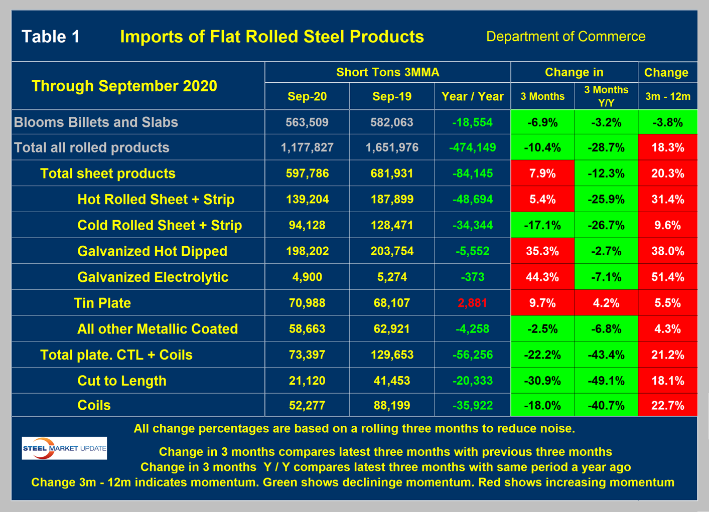 Total rolled product imports in September were down by 28.7 percent on a three-month moving average (3MMA) basis year over year. This was the 11th consecutive month in which imports were down by more than 20 percent compared to the same month last year.