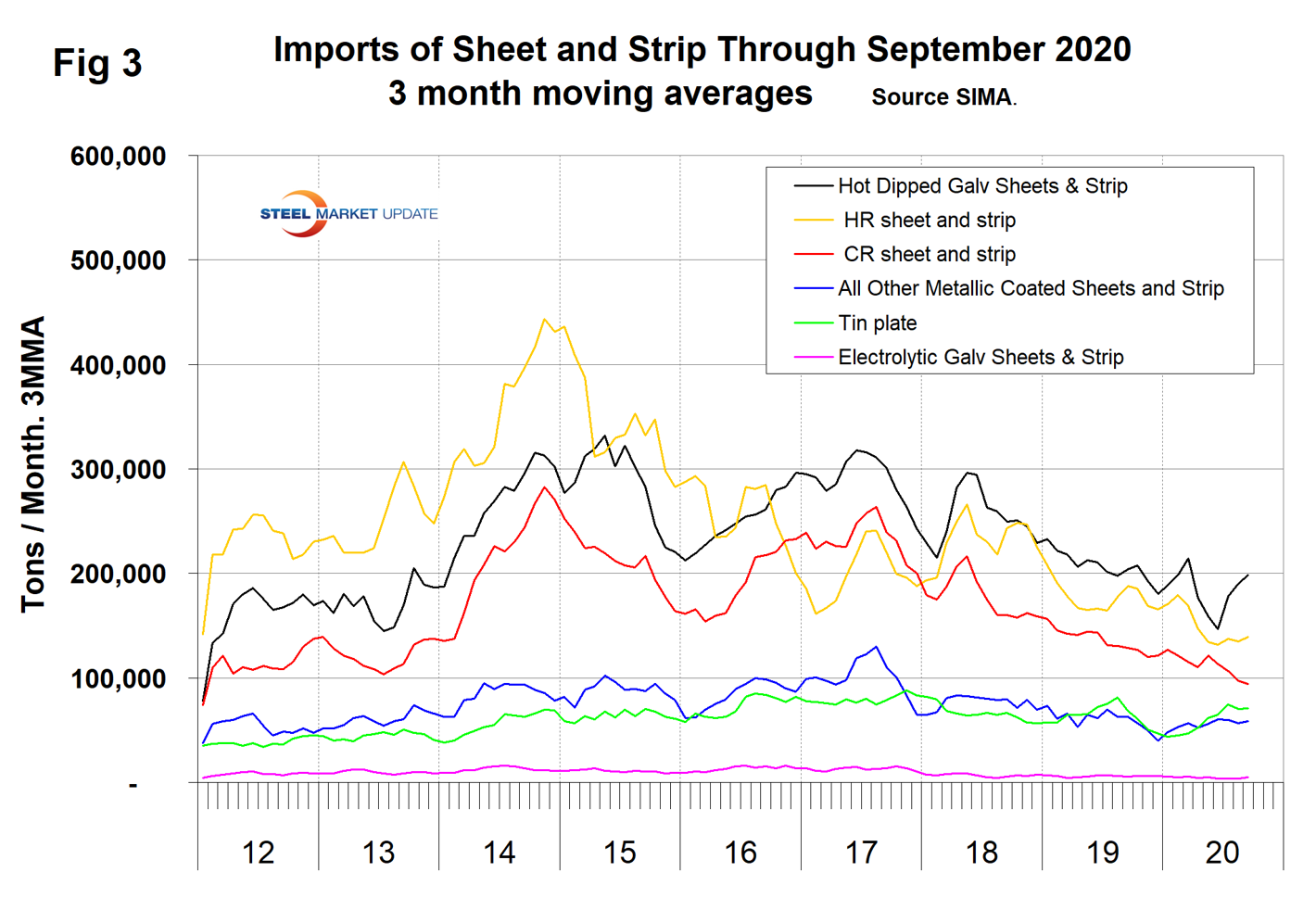 This early look at September’s import volume is based on data from the Steel Import Monitoring and Analysis (SIMA) system of the Department of Commerce. This excerpt covers steel sheet and plate (see the full article for additional data on long and tubular products). All volumes in this analysis are reported in short tons. Three-month moving averages are used rather than single-month results to smooth out monthly variability.