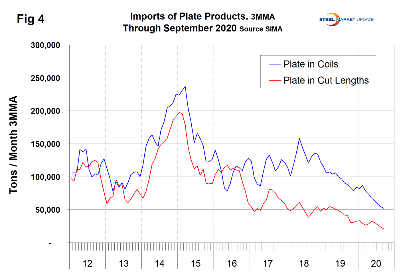 Imports of total carbon and low alloy rolled products in September totaled 1.091 million tons on a single-month basis, down from 1.562 million tons in January, which was the high month for the year. Year over year on a 3MMA basis, sheet products were down by 12.3 percent and plate products were down by 43.4 percent.