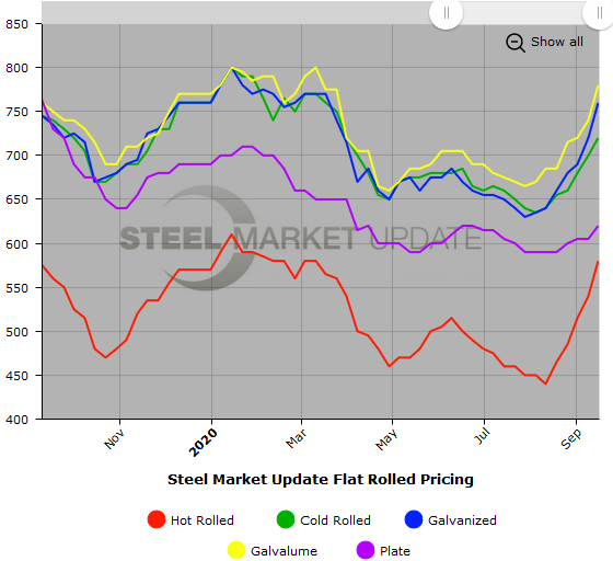 SMU Note: Below is a graphic showing our hot rolled, cold rolled, galvanized, Galvalume and plate price history. This data is available here on our website with our interactive pricing tool. If you need help navigating the website or need to know your login information, contact us at info@SteelMarketUpdate.com.