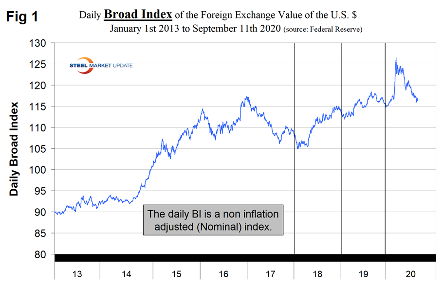 Explanation of Data Sources: The Broad Index is published by the Federal Reserve on both a daily and monthly basis. It is a weighted average of the foreign exchange values of the U.S. dollar against the currencies of a large group of major U.S. trading partners. The index weights, which change over time, are derived from U.S. export shares and from U.S. and foreign import shares. The data are noon buying rates in New York for cable transfers payable in the listed currencies. At SMU we use the historical exchange rates published in the Oanda Forex trading platform to track the currency value of the U.S. dollar against that of 16 steel trading nations. Oanda operates within the guidelines of six major regulatory authorities around the world and provides access to over 70 currency pairs. Approximately $4 trillion U.S. dollars are traded every day on foreign exchange markets.