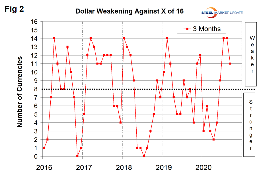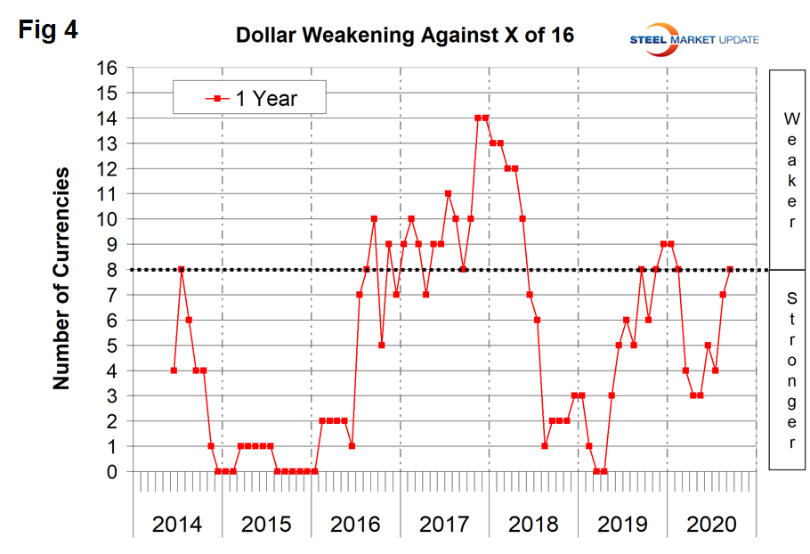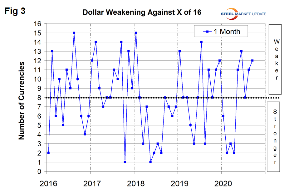 Figure 4 shows the 12-month picture, which removes some of the volatility by showing the number of currencies against which the dollar was weakening on a year-over-year basis. In March and April 2019, the dollar strengthened against all 16 at the 12-month level. There was a progressive weakening until December 2019 and January 2020 when the dollar weakened against nine of the 16. In the 12 months leading up to mid-September 2020, the dollar weakened against eight of the 16. A weakening dollar puts upward pressure on globally traded commodity prices including most steelmaking raw materials.