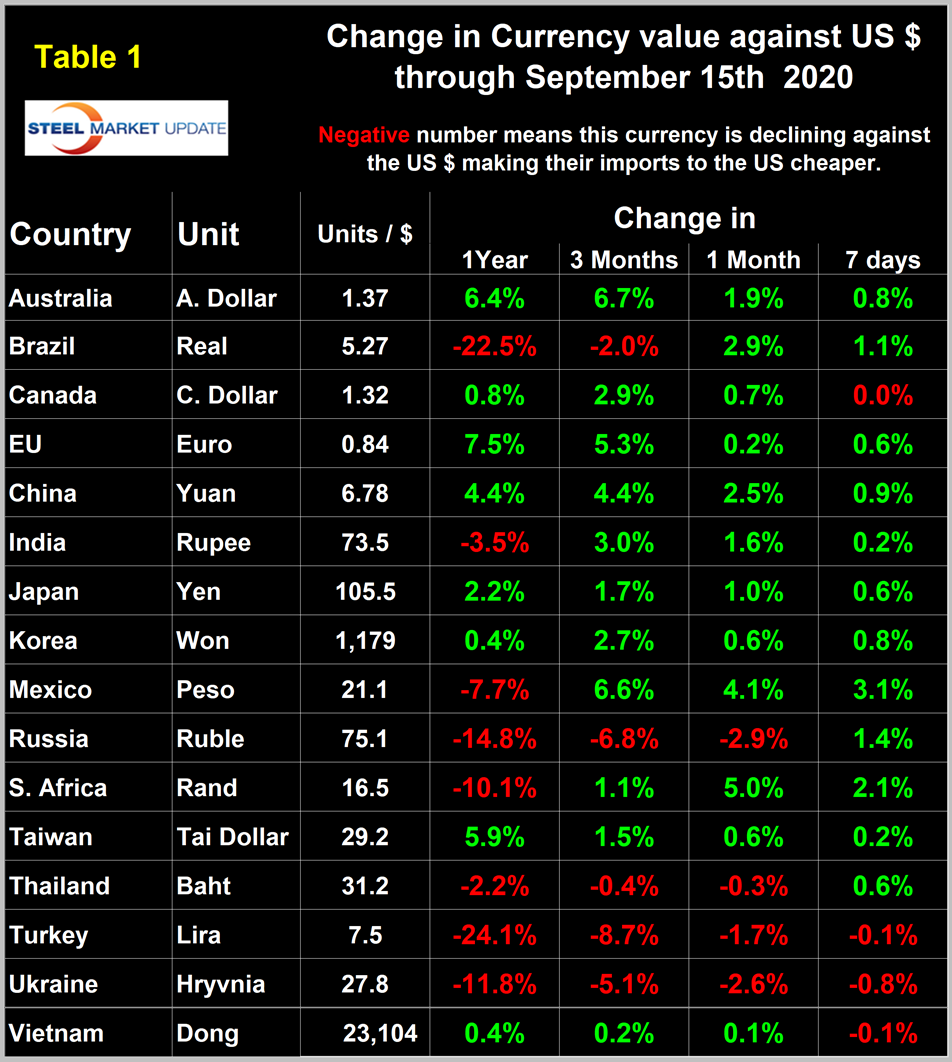 At Steel Market Update, we track the currencies of the 16 pre-eminent global steel and iron ore trading nations on a daily basis and report monthly. The currencies of these 16 don’t necessarily follow the Broad Index value of the U.S, dollar, but in the last three months have done so. The latest value of the Broad Index as published by the Federal Reserve was Sept. 11 on which date the dollar was down by 2.4 percent in three months and by 0.5 percent in 30 days. At the three month level, the daily broad index has declined every day since May 14. Our country data from Oanda was current as of Sept. 15.