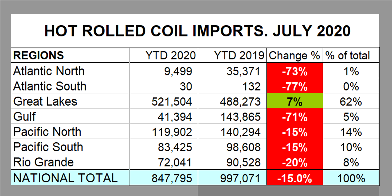National level import reports do a good job of measuring the overall market pressure caused by the imports of individual products. The downside is that there are huge regional differences. This report examines hot rolled coil imports by region through July 2020.
