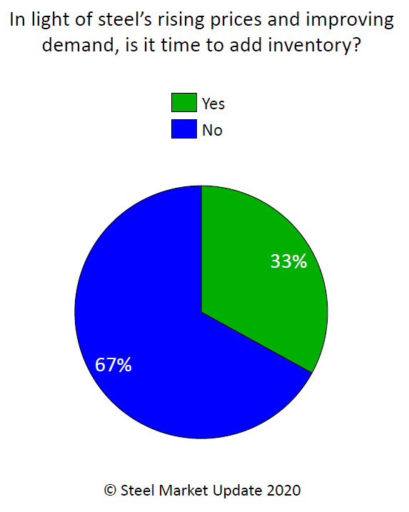 Service centers and and other buyers traditionally jump into the market to buy ahead of rising steel prices. Steel prices are clearly on the rise, but only about one-third (33 percent) of buyers responding to Steel Market Update’s questionnaire this week said they feel it’s time to add inventory.