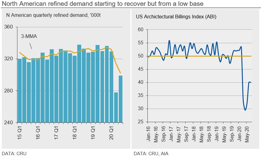 As has been the case in most regions, demand from general galvanisers has been much more robust throughout the pandemic and demand in recent weeks has remained stable. In the USA, we estimate that construction output will contract by just 1.3% in 2020, a far less severe contraction than in other end-use sectors but significantly weaker than our forecast of 2% growth at the start of the year. The key risk is that construction is impacted in several months time due to new projects being placed on hold. The forward-looking architectural billings index remained stable but in contraction for a fifth straight month in July, suggesting that construction demand will remain weak into next year. In general, zinc demand from brass mills has reportedly improved in August and been stable in September according to market contacts. We estimate that US output of Cu alloy rods, bars and sections (RBS) declined 10.6% in H1. We understand that alloyers and oxide manufacturers have also been taking slightly more refined zinc over the past few weeks.