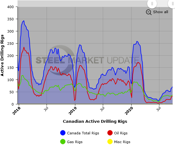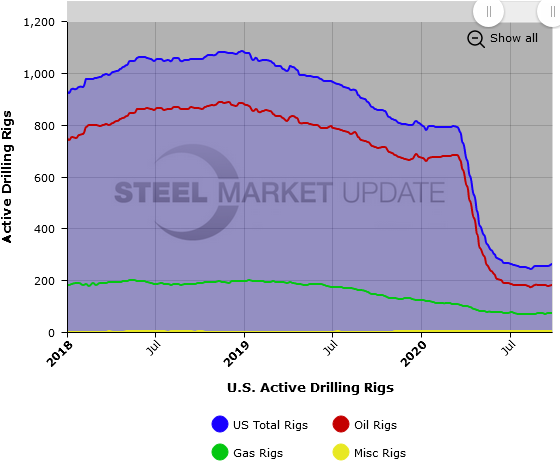 The number of active U.S and Canadian gas and oil rigs increased this past week, according to oilfield services company Baker Hughes. The active drill rigs count is important to the steel industry because it is a leading indicator of oil country tubular goods demand.