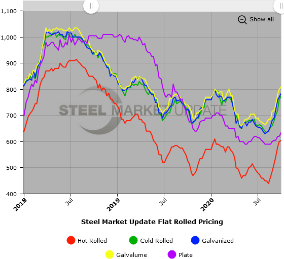 SMU Note: Below is a graphic showing our hot rolled, cold rolled, galvanized, Galvalume and plate price history. This data is available here on our website with our interactive pricing tool. If you need help navigating the website or need to know your login information, contact us at info@SteelMarketUpdate.com.
