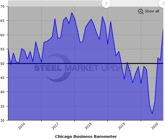 Below is a graph showing the history of the Chicago Business Barometer. You will need to view the graph on our website to use its interactive features; you can do so by clicking here. If you need assistance logging in to or navigating the website, please contact us at info@SteelMarketUpdate.com.