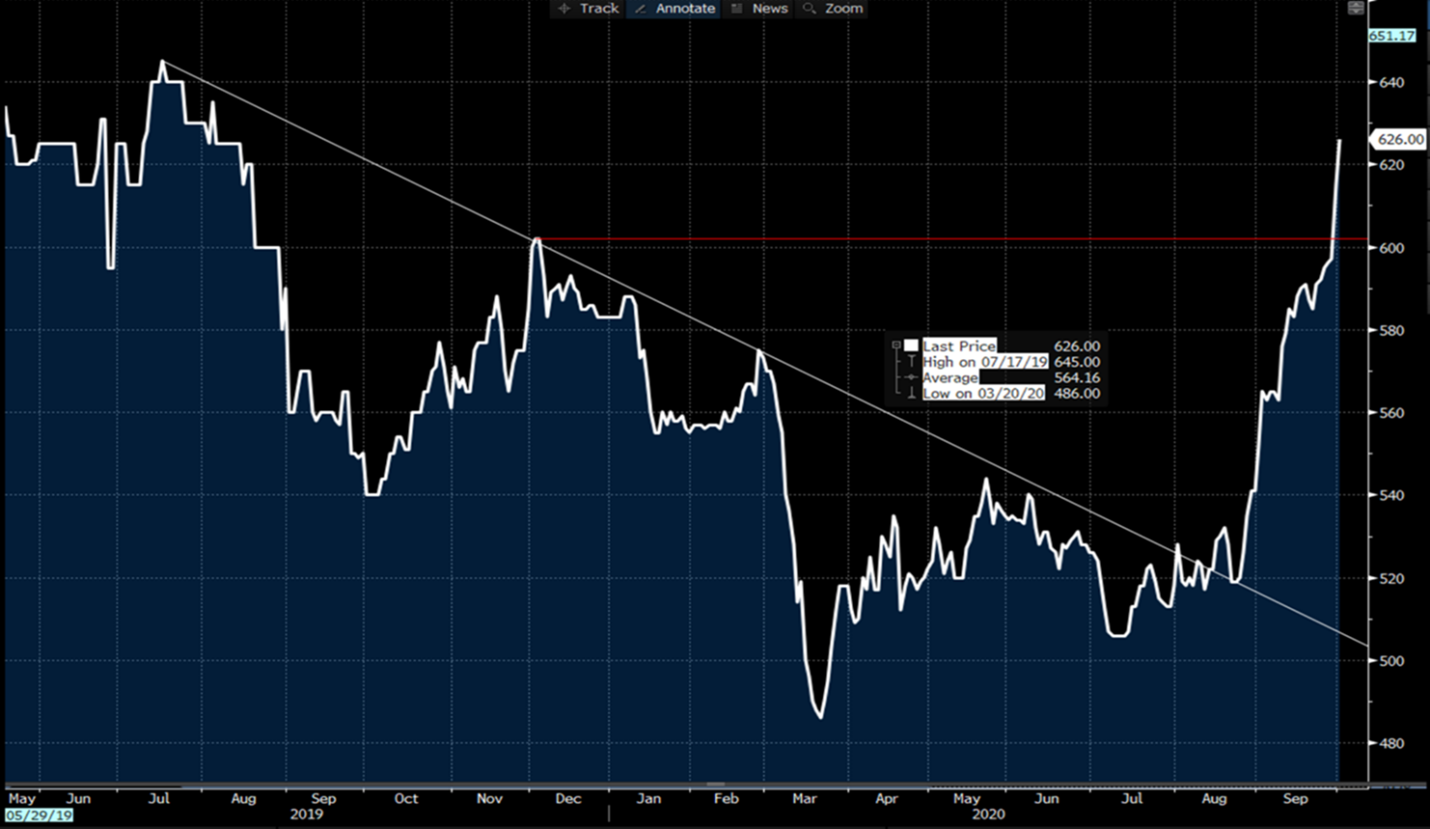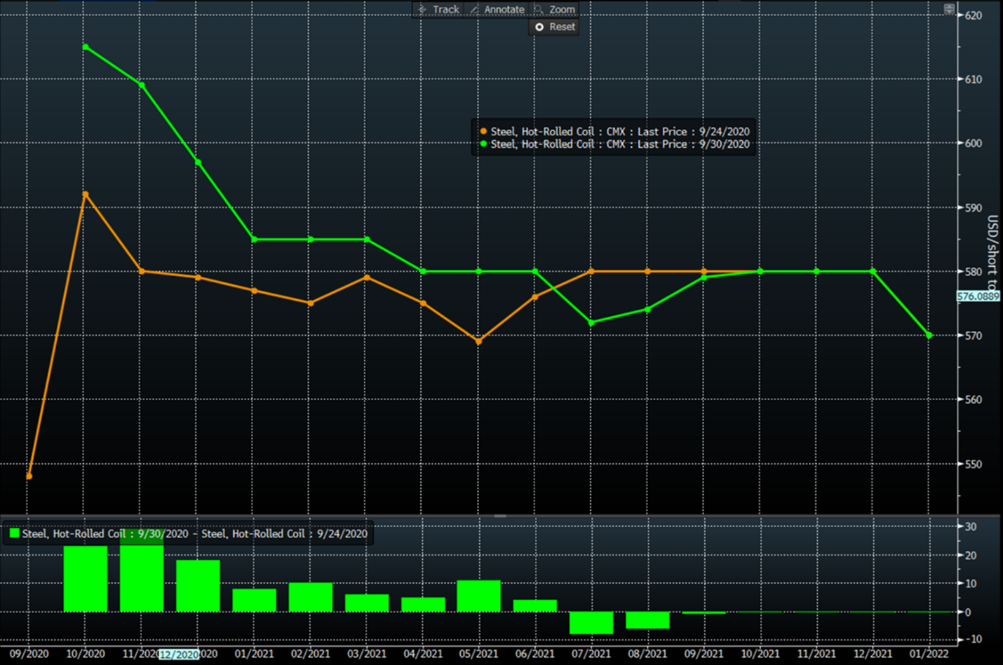 You can see from the below chart that the HRC active contract broke out of its long-term downtrend in mid-August, and then just recently broke out above the “resistance” line at just over the $600 level. While we aren’t expert chart readers, the next resistance level looks to be around $640.