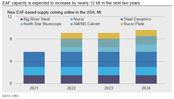 Over the next 12 months, 5.7 Mt of new EAF-based sheet steel production will come online in the USA. In addition, 6.9 Mt of new hot strip mills in Mexico will also come online and 8.5 Mt of blast furnaces in North America remain temporarily idled due to Covid-19. Furthermore, in 2022, an additional 3.4 Mt of new EAF-based flat rolled supply will start up. These new furnaces and hot strip mills will be cost-competitive and regionally focused.