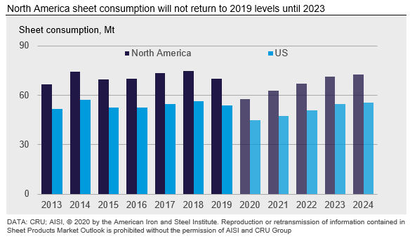 While supply to the North American market is set to increase rapidly, demand for sheet and plate products has taken a substantial hit due to the economic challenges surrounding the Covid-19 pandemic. In fact, sheet consumption in both the USA and North America more generally, is forecast to fall by at least 16 percent y/y this year and not return to 2019 levels until 2023.